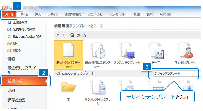 「ファイル」タブ−「新規作成」をクリックし「Office.comでテンプレートを検索」ボックスに「デザインテンプレート」と入力しEnter