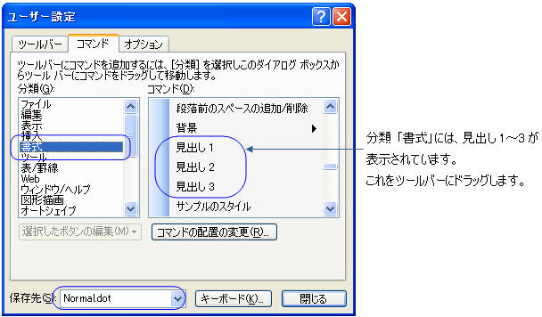 「コマンド」タブで「書式」を選択し、[コマンド]ボックス内の見出し○をツールバーにドラッグ