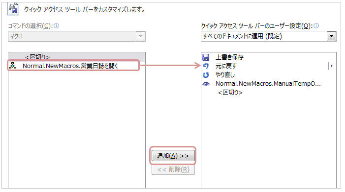 マクロボタンを選択し、「追加」をクリック(=クイックアクセスツールバーに配置)し「OK」をクリック