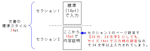 文書 の別紙として内容証明を付ける為、""文書の途中から26文字、20行の書式にしたい"といった質問を受けることがあります。 セクション区切りを 挿入すれば、文字数/行数の 指定は簡単ですが、問題はフォントサイズです。Wordのページ設定で指定する文字数と行数は【標準スタイルで入力した場合】のものです。 その文書の標準スタイル のフォントが14ptなのに10ptで入力しては指定した文字数と行数になりません。