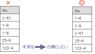 ハイフンを含む数値を数値順に並べ替えようとしても希望通りに並べ替えができないことがあります。 例えば 「○章−○」のように並べ替えたい場合にうまくいきません。 この場合はハイフンをピリオドに変換し 、【数値順】に並べ替えを行います。(ピリオドであれば小数とみなされ、数値順に並べ替えができます)