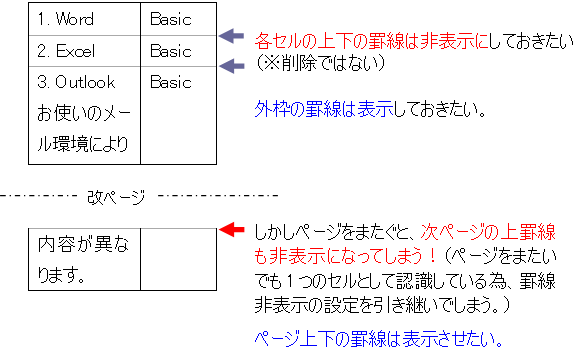 ページをまたぐ表で、上(下)罫線が非表示になってしまう、という御質問をいただきます。これは表内のセル罫線を非表示にしている場合に よく起こります。