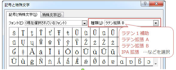 - 「種類」で「ラテン拡張A・B」「ラテン1補助」「IPA拡張」などを選択し、文字を挿入する
