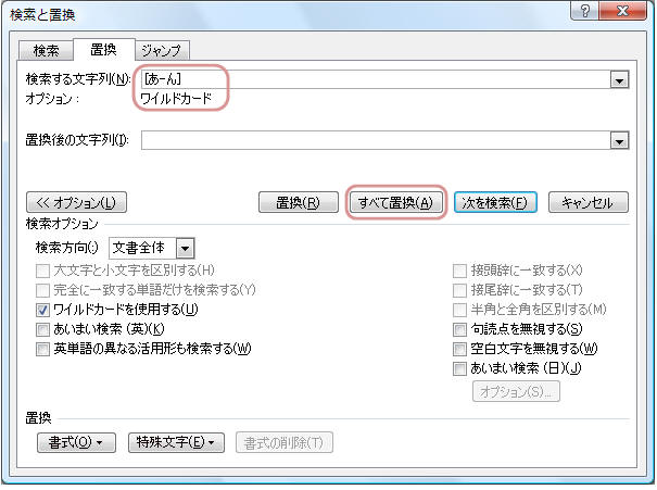 結果、ひらがなのみを対象に置換(今回は置換後の文字列ボックスが空白なので削除)されます。