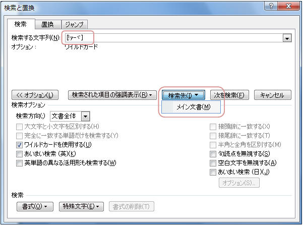 もし「ワイルドカードを覚えるのが面倒!」という場合は、一旦文書内全ての文字を全角にした後「検索」ダイアログで「あいまい検索」のチェックを外し、「特殊文字」−「任意の数字」を選択して「検索先▼」−「メイン文書」をクリックします。これで数字のみ選択されるので、「文字種の変換」から「半角」をクリックしましょう。同様に英字も「任意の英字」で選択し半角にしましょう。