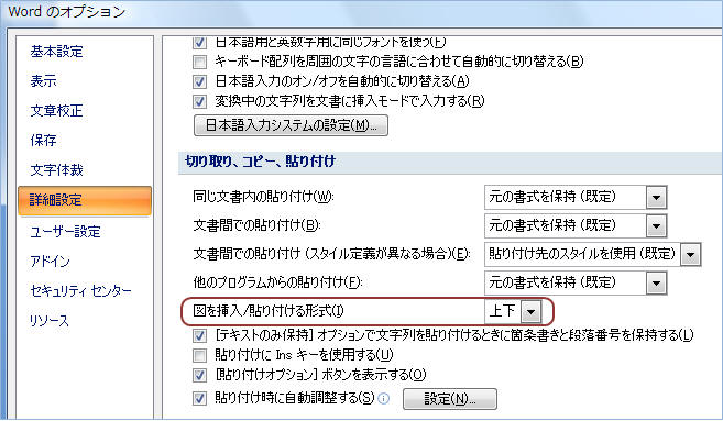 Officeボタン−「Wordのオプション」をクリック 左ペインで「詳細設定」をクリック 「切り取り、コピー、貼り付け」枠−「図を挿入/貼り付ける形式▼」で任意のものを選択する