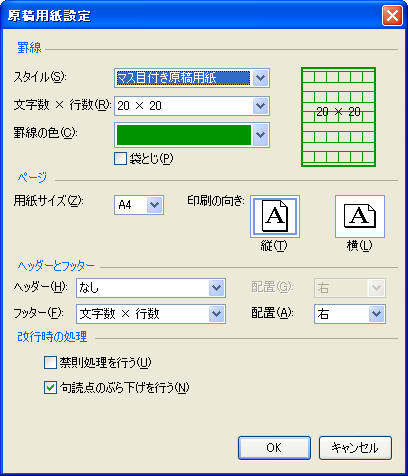 原稿用紙設定ダイアログで任意のスタイル(マス目付きにするか等)や、文字数と行数を指定し「OK」をクリック