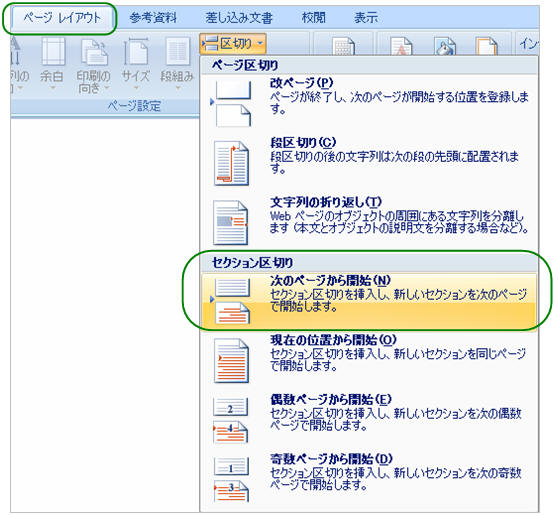 「ページレイアウト」タブ−「区切り▼」−「セクション区切り