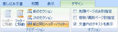 「デザイン」タブで、「前と同じヘッダー/フッター」をクリック