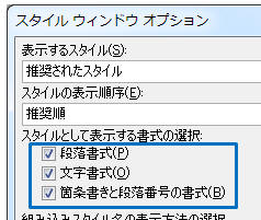 スタイルウィンドウの下部の「オプション」をクリックし「段落書式」「文字書式」「箇条書きと段落番号の書式」にチェックを入れる