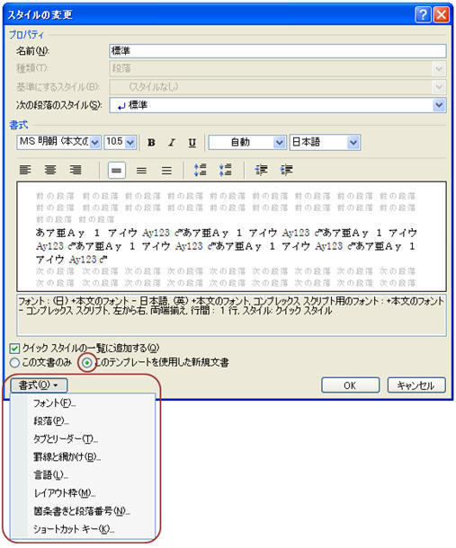 「このテンプレートを使用した新規文書」をONにし、「書式(O) ▼」をクリックして「フォント」をクリック(★段落書式の場合は「段落」をクリック)