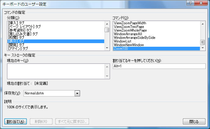 「分類」=「表示タブ」を選択し、「コマンド」ボックスで「Zoom100」を選択します。