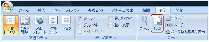 【表示】タブ−「ズーム」枠にある「100%」ボタンをクリックします。