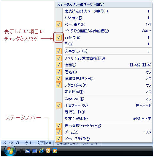 Word2007以降、ステータスバーから「行」や「セクション番号」が消えたというお問い合わせが多くなりました。 デフォルトで「行」や「セクション番号」、「桁(列)」などは非表示となっています。表示するには以下のように操作します。 ステータスバー上で右クリックし、表示させたい項目にチェックを入れる