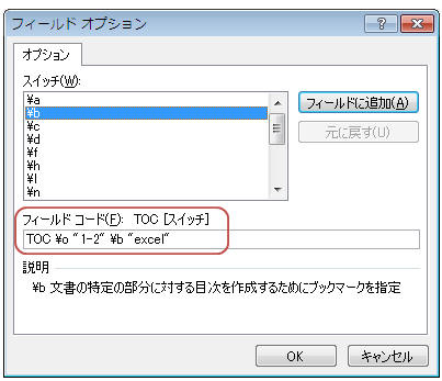 「フィールドコードボックス」に、目次として参照したい範囲のブックマーク名を入力(ブックマーク名が「excel」なら、\b