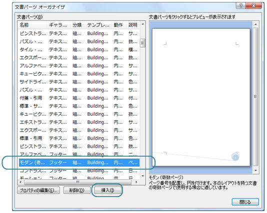 「挿入」タブ−「クイックパーツ」−「文書パーツオーガナイザ」をクリックして挿入(全クイックパーツが表示)