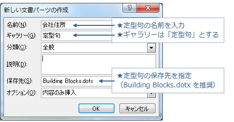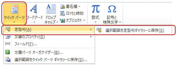 ここでは定型句ギャラリーに保存していますが、「選択範囲をクイックパーツギャラリーに保存」としても可です(自由)