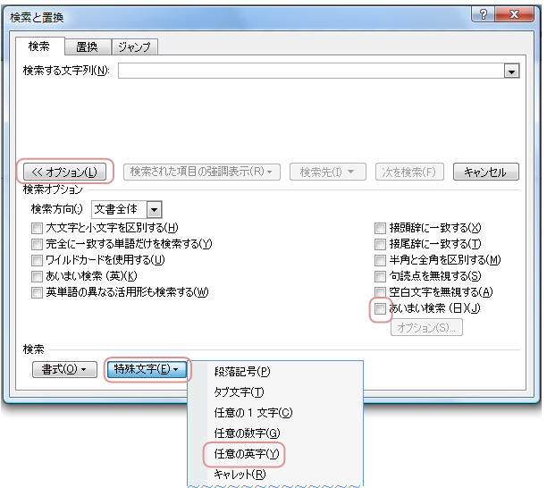 「あいまい検索」にチェックが入っていたら外し、「特殊文字▼」−「任意の 英字」をクリック