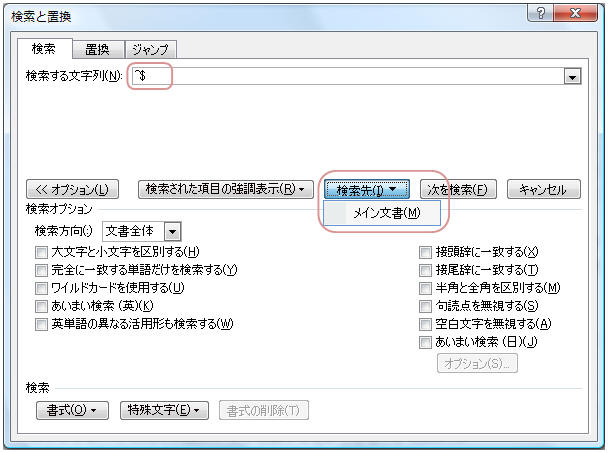 「検索する文字列」ボックスに「^$」と入力されたら、「検索先▼」−「メイン文書」をクリック