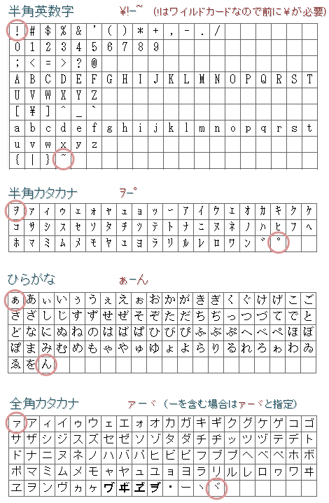 (注:漢字の範囲として亜-煕(又は亜-Kや亜-龠)が使われることがありますがこれはS-JIS漢字のみなのでヒットしない漢字があります。一-Iを使うことをお奨めします。)