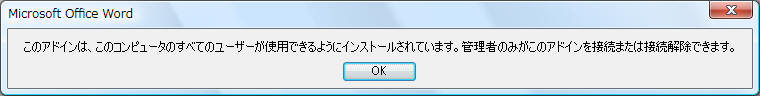 Word:「このアドインは、このコンピュータのすべてのユーザーが使用できるようにインストールされています。管理者のみがこのアドインを接続または接続解除できます」というメッセージが表示され、アドインの 設定変更ができない。 |