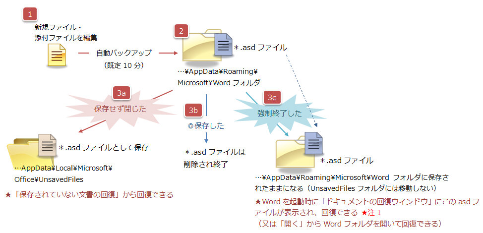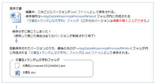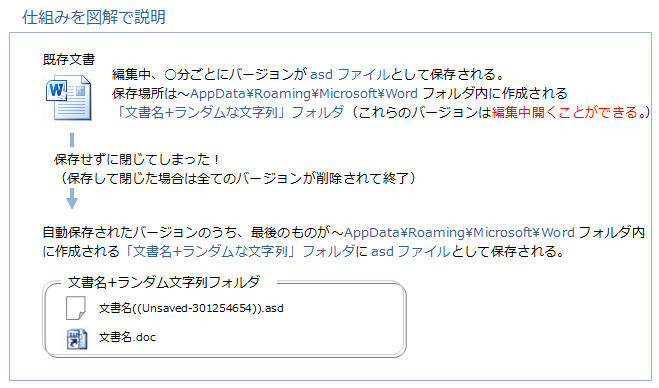 ★ ファイル回復に関する注意 ★ ファイルは自動回復用のフォルダ(~AppData\Roaming\Microsoft\Word、又は~AppData\Local\Microsoft\Office\UnsavedFiles)にアクセスして開く 必要があります。(他の場所(デスクトップなど)にasdファイルをコピーしても開けません。)◆参考:asdファイルを開くには
