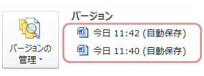 Office2010(Word,Excel,PowerPoint)では編集中に○分間隔(既定10分)で状態が自動保存されるようになりました。編集中、これらのバージョンを取り出して作業することができます。(※既存ファイルに限ります。新規ファイル(未保存のファイル)では以前のバージョンは作成されません)