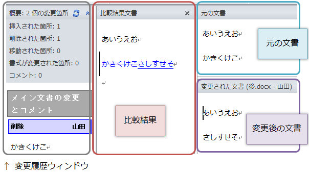デフォルトでは、【比較結果】【元の文書】【変更後の文書】が表示されます。