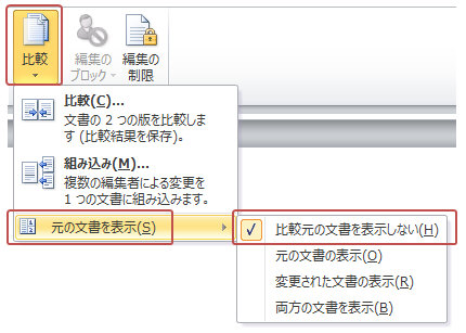 比較結果のみ表示したい場合は「比較▼」−「元の文書を表示」−「比較元の文書を表示しない」をクリックします。
