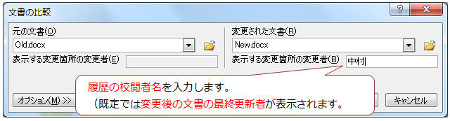「元の文書」ボックスに変更前の文書、「変更された文書」に変更後の文書を指定 ★ボックスのリスト▼から最近使ったファイルを選択できます。又はボックス横の「ファイルを開く」ボタンから指定します。 ※「表示する変更箇所の変更者」ボックスには、結果に記録される履歴の校閲者名を入力します。 (指定しない場合は変更後の文書の最終更新者)※ 変更履歴が記録されていない文書同士を比較する為、履歴が記録されていた場合は反映してから比較されます。