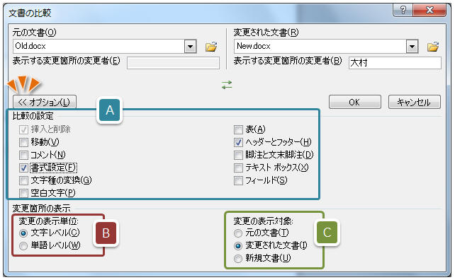 比較対象を指定します。除外された項目は比較時に無視※されます。(※比較しない為、 比較結果を表示する文書のデータが残ります。新規文書に比較結果を出す場合は「変更された文書」のデータが残ります) 文字単位で比較するか、単語単位で比較するかを選択します。例えば「Word」と「Ward」を比較した場合、文字レベル→「Woard」、単語レベル→「Word Ward」となります 比較結果をどの文書に表示するかを指定します。元文書、変更後の文書、新しい文書のいづれかを選択します。 (それぞれの違いについては「比較結果「変更の表示対象」による違いとは」参照してください。)