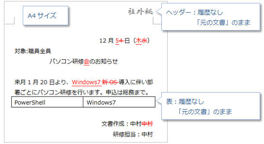 「元文書」に履歴を表示します。比較対象以外の部分は元の文書の状態が保持されます。