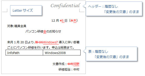 「変更後の文書」に履歴を表示します。比較対象以外の部分は変更後の文書の状態が保持されます。