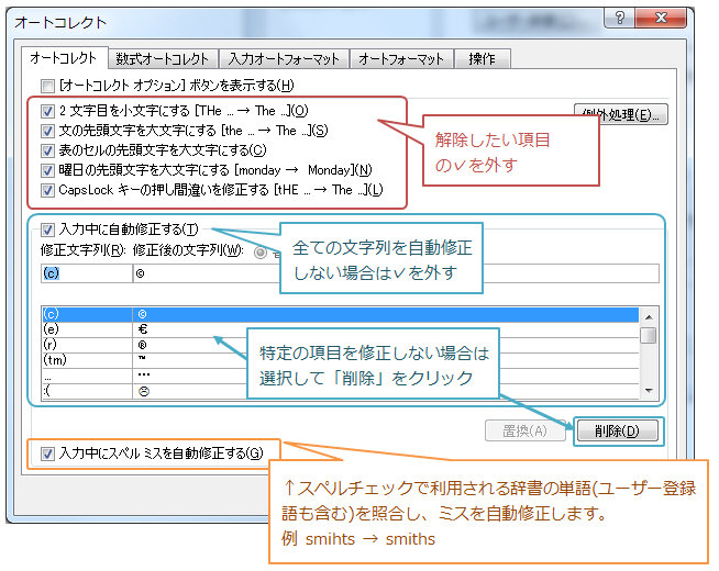解除したい項目のチェックを外す・削除する ※「入力中にスペルミスを自動修正する」のチェックを外しても、このダイアログに表示されている項目は修正されます。