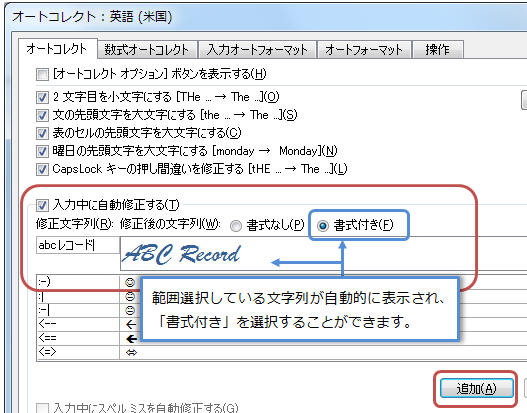 「書式付き」でオートコレクト項目を追加した場合、修正後の文字列には書式が設定されます。