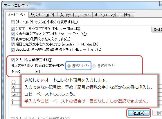 ※「書式付き」とは、書式も同時に登録できるオートコレクト項目のことです。