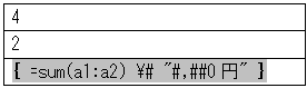 ※式フィールド内ではセル参照を利用できます。例えば下記の場合、セルA1とA2の合計を出すので=SUM(A1:A2)とします。表示形式も指定したい場合は\#に続けてダブルクォーテーション内に入力します。
