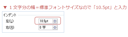 ただデフォルトでは標準フォントサイズ(10.5pt)で入力し、字送りも同じ(10.5pt)なので希望通りの文字数でインデントできます。しかし文字数を指定している文書や、標準フォントサイズ以外で入力している場合は「字送り」=1文字とは限らず1字インデントは1字の幅にはなりません。