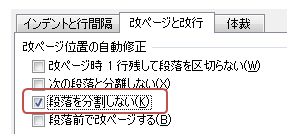 「改ページと改行」タブで「段落を分割しない」のチェックを外す