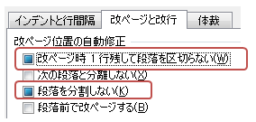 「改ページと改行」タブにある「改ページ位置の自動修正」機能の4つのチェックボックスを完全にOFFにする