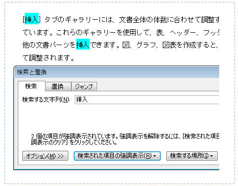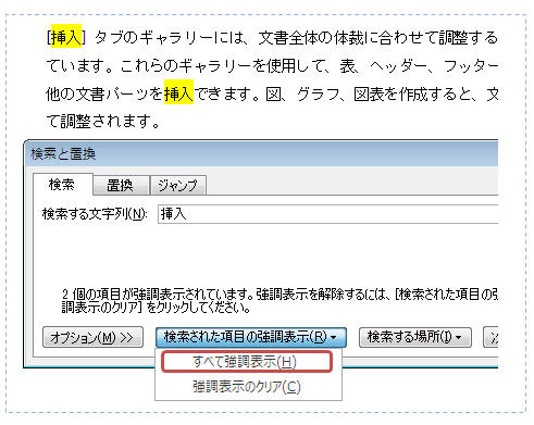 Word2010では、検索した文字列を黄色の蛍光ペンで強調表示(選択)することができます。