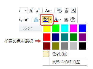 「ホーム」タブ−「フォント」グループ−「蛍光ペンの色▼」ボタンから任意の色をクリックし、ESCキー※1を押す (※1:ESCキーを押す理由…このまま文字列を選択すると蛍光ペンが設定されてしまうので念のために解除しています。)