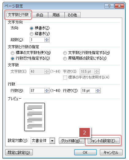 「文字数と行数」タブで「フォントの設定」をクリック(※「フォントの設定