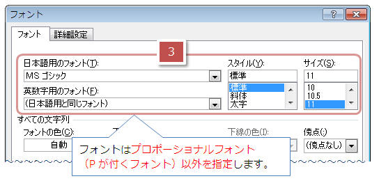 「フォント」ダイアログでフォント、フォントサイズを指定