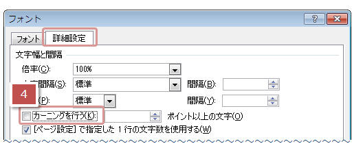 フォントダイアログの「詳細設定」タブをクリックし「カーニングを行う」のチェックを外し「OK」をクリック