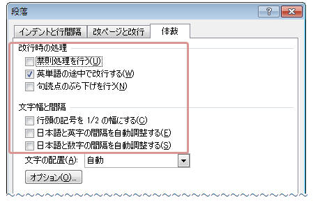「体裁」タブで「英単語の途中で改行する」のみチェックを入れ、他は全て外す