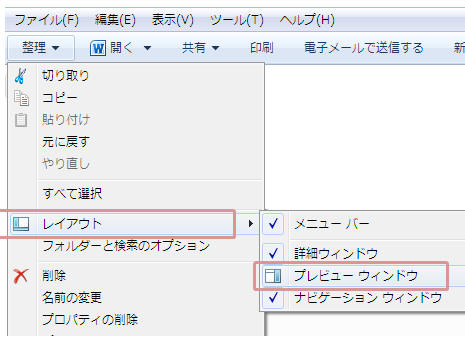 ▼▼ フォルダの「整理▼」−「レイアウト」−「プレビューウィンドウ」にチェック