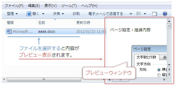 Windows7やVistaでは、Officeアプリケーションなどの文書も開く前にプレビューウィンドウで内容を確認できます。