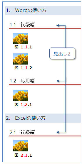 | 注:この操作を行うには予め見出しに段落番号(アウトライン番号)を設定しておく必要があります。(見出しに番号が設定されていないと「図