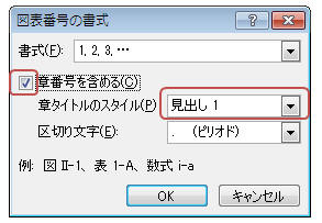 見出し番号として使用する”見出しスタイル”を指定すると、その見出しの章番号と図表の番号が組み合わせて挿入されます。